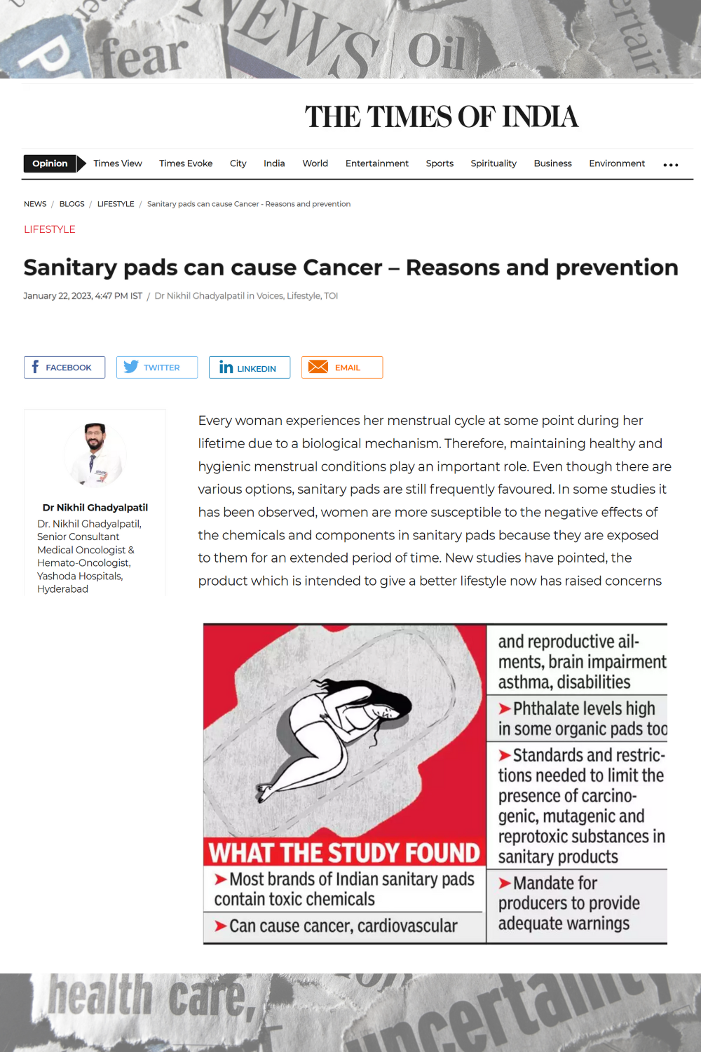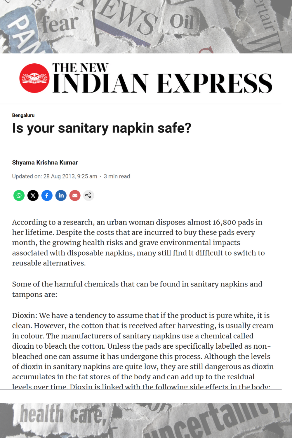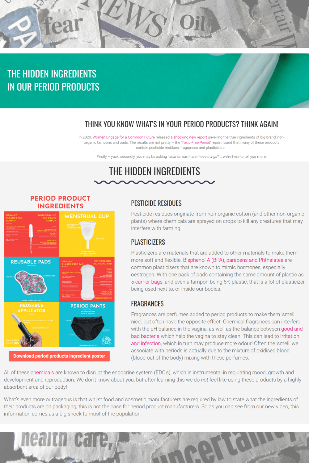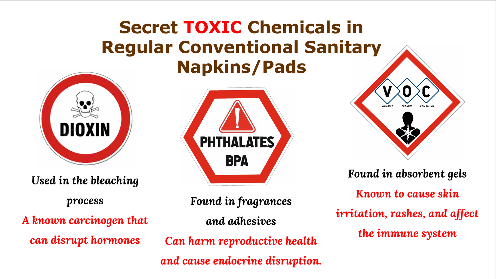 Sanitary pads and tampons often contain toxic chemicals like dioxins, phthalates, volatile organic compounds (VOCs). These substances may pose long-term health risks due to repeated exposure over a woman’s lifetime. Since menstrual products are classified as medical devices, manufacturers are not legally required to disclose ingredients, making it difficult for consumers to make informed choices.